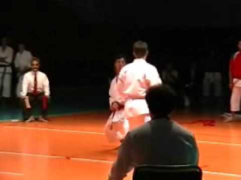 The gentleman performing the mae-geri in question is a sempai of mine in the American JKA, and an outstanding fighter and all around karate-ka. As you can see his mae-geri pretty much cuts his opponent in half, very little backward motion of the opponent. Hit and fall. That's mae-geri done right!